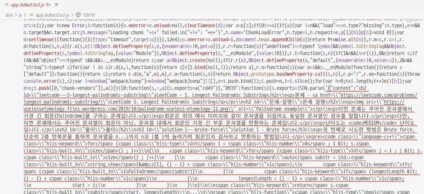 빌드된 app.js 파일의 내용입니다. 알아보기는 힘들지만, 게시글의 모든 내용이 한 파일내에 담겨있습니다. 이 뜻은 유저가 제 블로그에 접속하면 원하지 않더라도 다른 모든 게시글의 내용을 강제로 로드하게 됩니다.