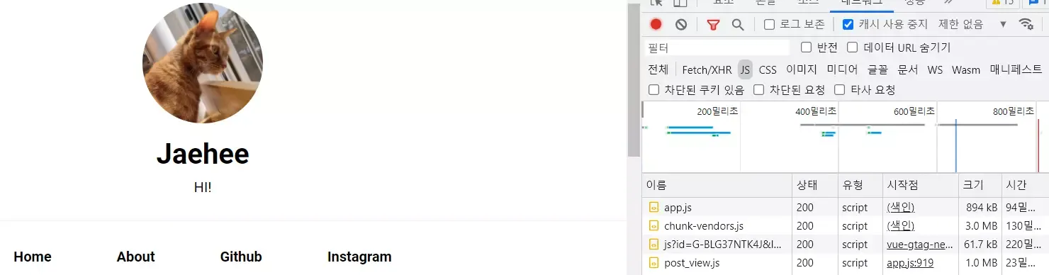 다시 한 번 크롬의 개발자 도구내 network profiler로 확인을 해보겠습니다.