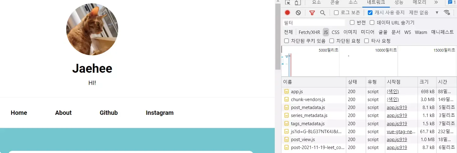 블로그 메인에 접속시 기존과 다르게 게시글 메타데이터에 대한 정보 파일이 분리되어 별도로 로딩됨을 확인할 수 있습니다. 또한 app.js의 파일 크기도 기존에는 800kb 크기에서 600kb쯔음의 크기로 줄어들었습니다.